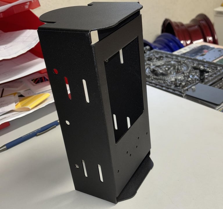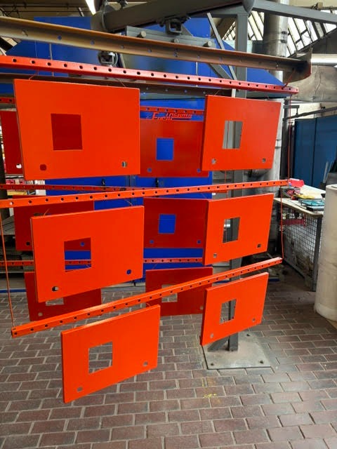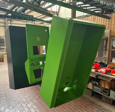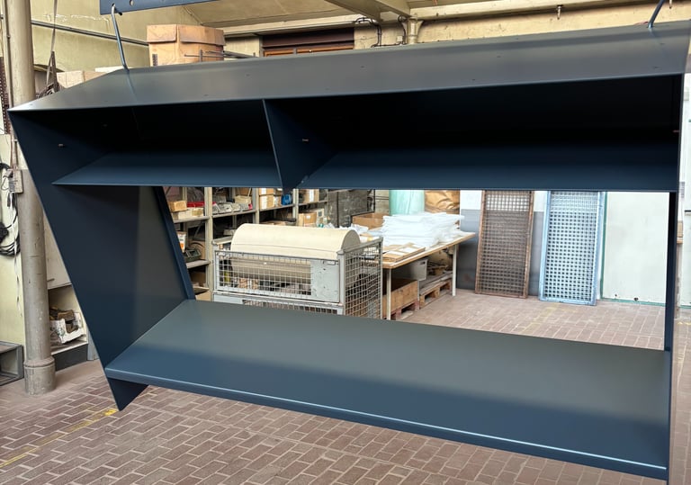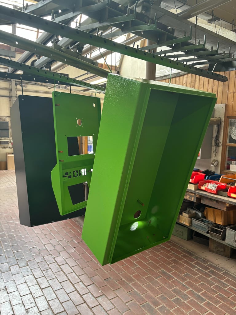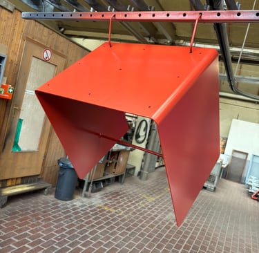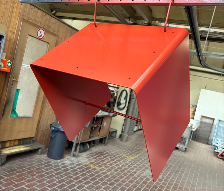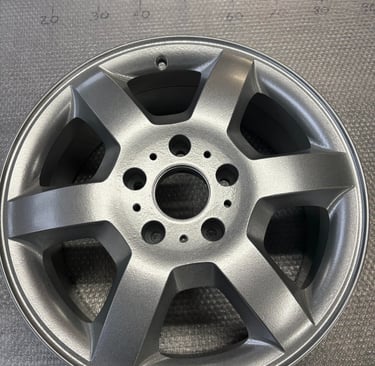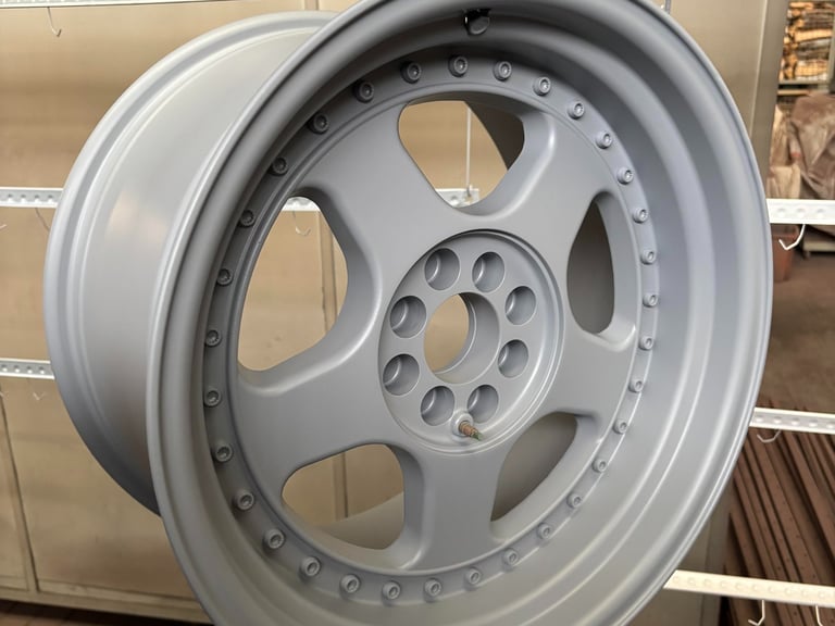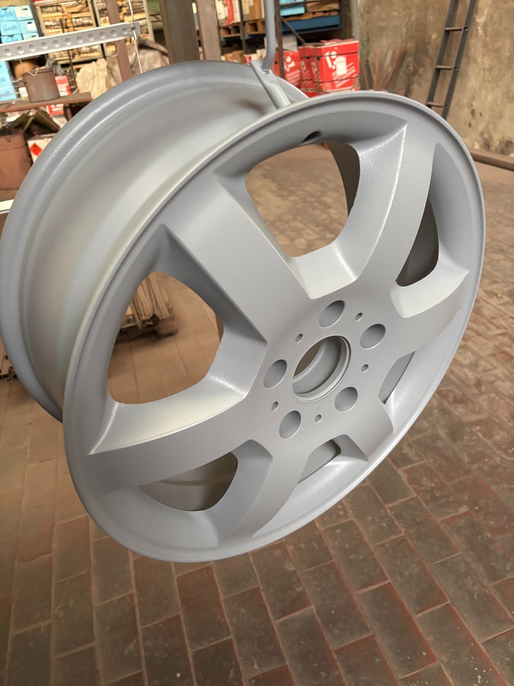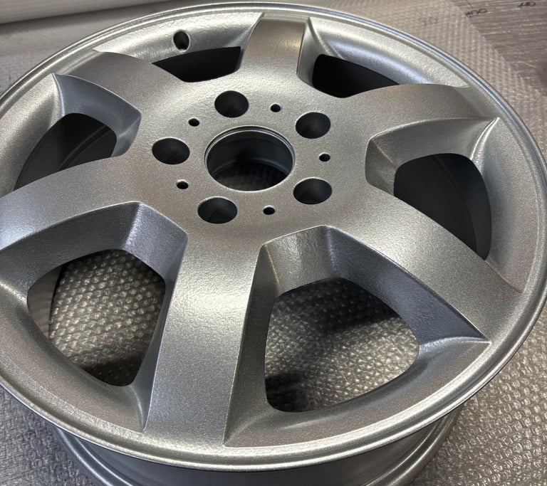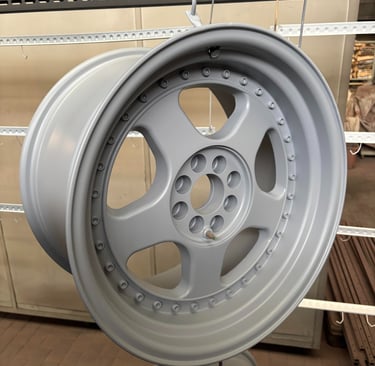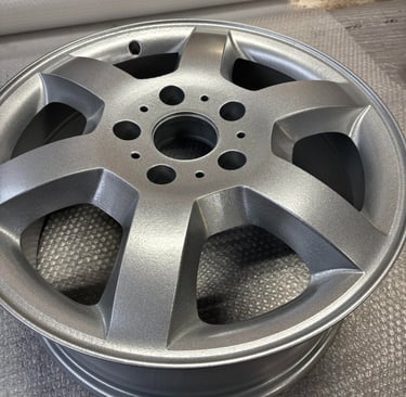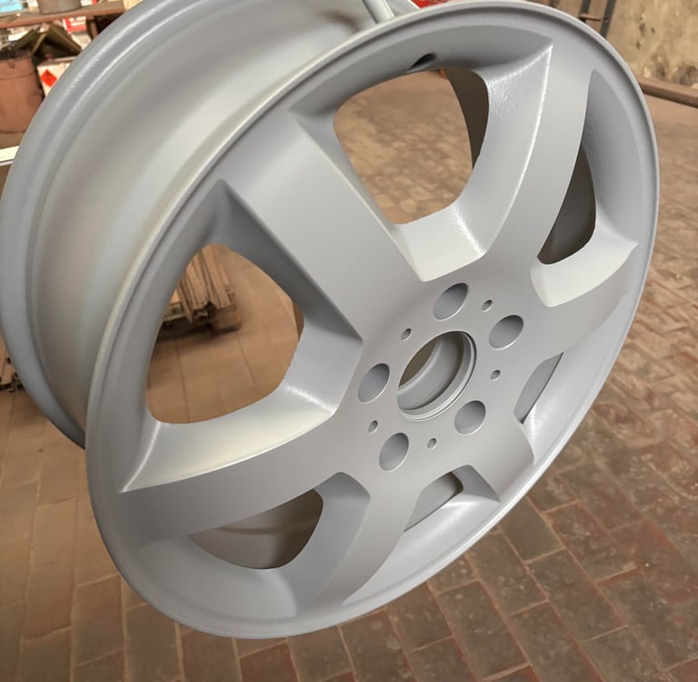 Hier die Felge fertig beschichtet in Schiefergrau: