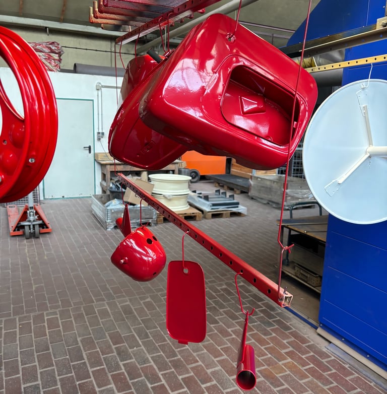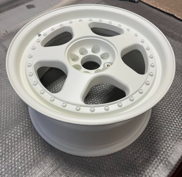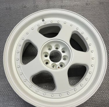 Hier die Felge fertig beschichtet in Verkehrsweiß: